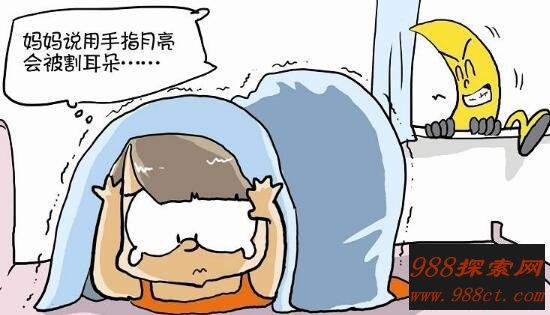 小时候常听父母说:“千万不要把手指指向月亮,因为月亮长得像月牙儿的镰刀。只要你把手指指向月亮,你的耳朵就可能被月亮割掉。但这种无关痛痒的禁忌在南方农村依然流传,因此成为农村十大恐怖禁忌之一。