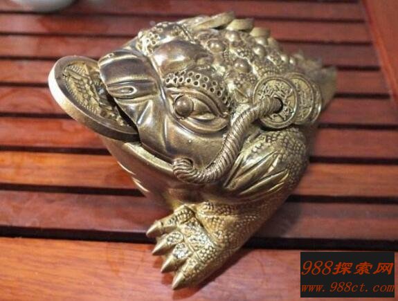 蟾蜍,也称旺财蟾蜍,它与普通蟾蜍的分别是它只有三只脚而不是四只。传说它本是妖精,后来改邪归正,四处吐钱给人,所以,就被人们当作旺财瑞兽来用。耍注意的是,摆放蟾蜍,头要向内,切记不可向外。否则所吐之钱皆吐出屋外,不但不能催旺财气,反而可能引致漏财。