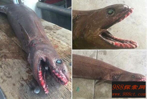 皱鳃鲨常见的鲨鱼外形完全不同,它们生活在500-1500米的深海,因为奇异的外形,这种古老的物种,头部呈蜥蜴状,也似蛇类,被许多古老神话称为海蛇一样的海怪。细长的躯体,蛇一样的脑袋,300颗牙齿对于其他鱼类和乌贼等是最大噩梦。