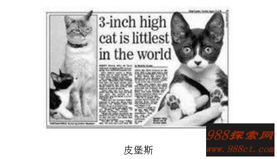 普通一只猫的寿命为8-12年,当然长寿的也有16-18年的。但皮堡斯是世上最小的猫,而且它还有缺陷,自然可能活不了这么久,现在估计都已经死了。而网上流传的皮堡斯照片,在一堆草莓中,还有在茶匙里坐着,在钢琴键盘上玩耍都不是真正的皮堡斯照片,只是网友ps出来的。