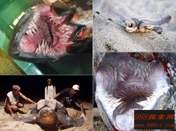 棱皮龟外表看上去憨态可掬,但是当它张开嘴时你还会联想到它可爱表情吗?棱皮龟的嘴里分布着数百个类似锯齿的钟乳状组织,科学家将其称为乳头状突起。棱皮龟主要以水母和其他软组织生物为食,其嘴巴内的钟乳状突起更能够牢牢的抓住水母等食物。由于水母本身几乎不含任何营养物质,所以棱皮龟存活一天几乎要消耗掉自身73%的体重,这也就是为何棱皮龟每天的大多数时间都在进食的原因。