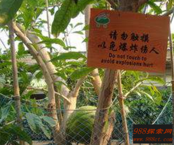 最奇异的是每当果实“铁西瓜”成熟时会自动爆裂开,锋利的“破片”四处飞射,杀伤力很是强大。有些外壳碎片甚至能飞出20多米。爆炸后经常会在附近发现被炸死的鸟类尸体。每当果实成熟的季节,当地人都避免走在“炸弹树”的树底下,生怕自己“中弹”。由于这种树过于危险,人们都不敢把房屋设在它的附近,过路的行人也不敢靠近它。