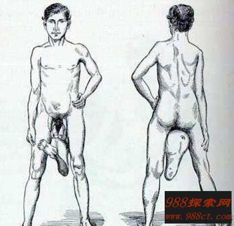 这个长有两个丁丁的人,是人类史上的十大怪胎之一。1983年出生于葡萄牙的非罗,父母都是正常的人并且还有两个别的小孩,他的职业是当一个“裸露症患者”,这似乎一向被医学界严格禁止的。他有两个功能正常的阴茎和三个阴囊,其中两边的两个阴囊各自有一个睾丸。