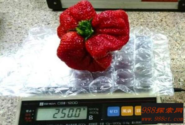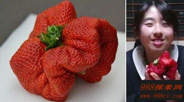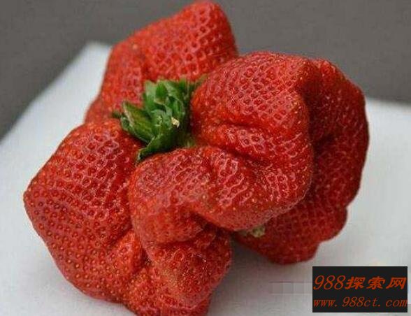 草莓营养价值高,而且非常好吃,世界上最大的草莓,它的大小就像一个大苹果,只不过现状有点怪异,是日本的草莓种植专家中尾浩二发现,经测量这个草莓长宽,达到了8厘米,12厘米,重达0.5斤,最早的吉尼斯记录是重达0.45斤的草莓,而且它刷新了吉尼斯新记录。