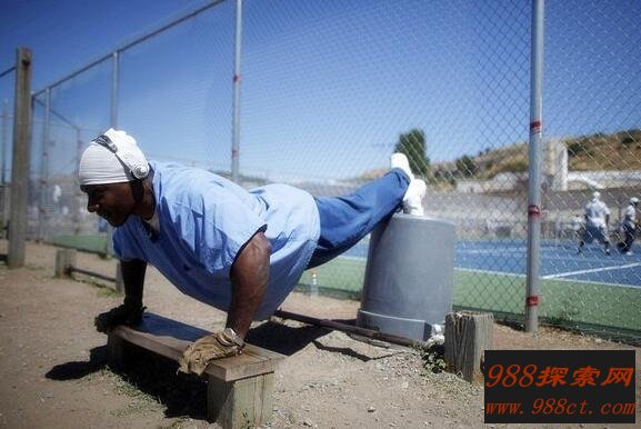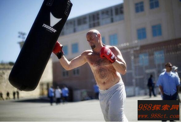 犯人们可以在狱警的监督下,在合适的时间选他们所喜爱的运动来进行身体锻炼,调节自己的情绪等。这名犯人正在室外练习自己喜爱的搏击运动,以此来发泄他在监狱的一切不愉快和暴躁的心情,不过要是这么锻炼下去他并不能改正,出狱后是不是会变得更加暴戾呢...
