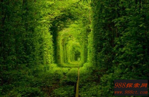 在乌克兰的东部地区克莱文镇有一段世界闻名的爱的隧道,事实上这只是一条已经废弃了的火车道,但是由于他真的美丽得让人有种窒息的感觉,被世界各地的游客们所喜爱。这条充满了绿色藤曼的拱形隧道放眼望去一片绿意盎然,它绿得让人窒息,相传情侣们可来此许下心愿,虔诚的爱会帮助他们美梦成真