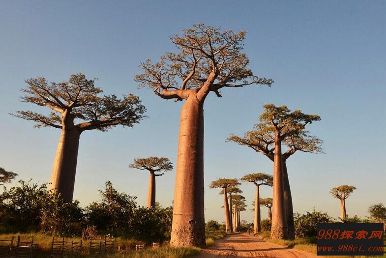 猴面包树的学名叫波巴布树(Baobab),树冠巨大,枝杈千奇百怪地聚集在树顶端生长,酷似盘虬卧龙的树根倒立生长在空中。