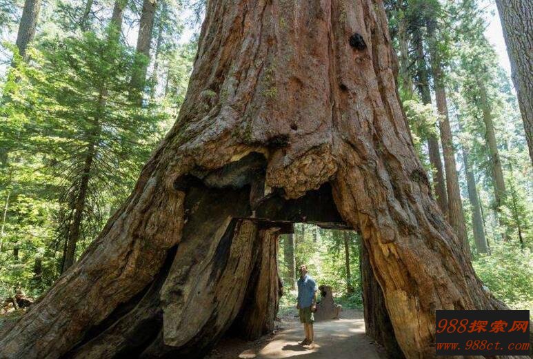 如果一颗树的直径能够一条小路的宽度,就会有这样的效果相比在开头给您介绍的两条腿的树,这棵红杉有气势的多,其高度达315英尺,约96米,下面的“桥洞”的尺寸为:宽6英尺,高9英尺,相当于1.8×2.75米。