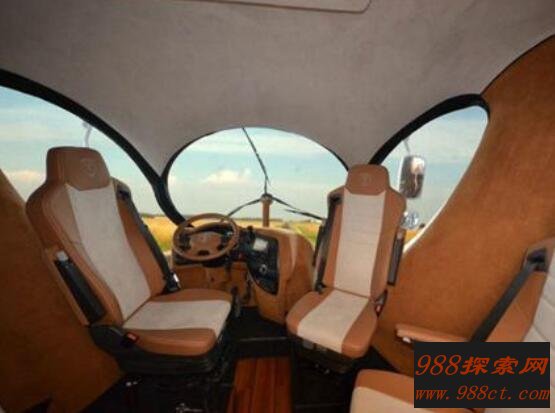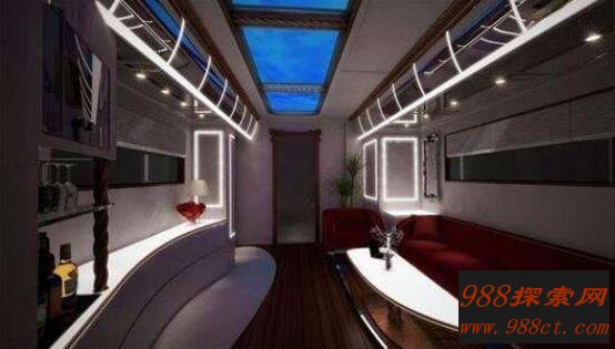 在这款车里面还有一个按钮,这样在车顶就会搭起一个景观阳台。你可以和朋友一起随意喝酒,沿途欣赏到美丽的风景线。在空间设施上应该是应有尽有,例如隐藏式酒吧,空调地暖,配上40寸大电视和多媒体娱乐系统。