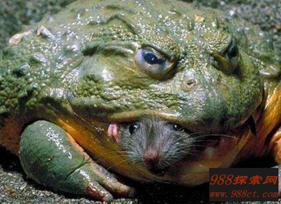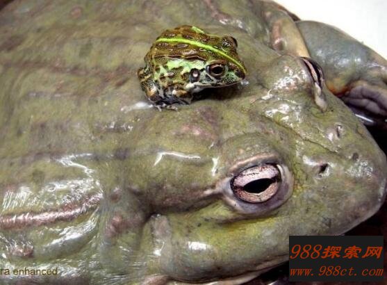 非洲牛蛙可不是世界体型最大的,属于第二大蛙,至于第一大蛙下面稍有介绍。非洲牛蛙天性爱吃,且食欲量非常大。在进食的时候能活活吞下一只大老鼠,若是比它体积大的则可以分次食之。
