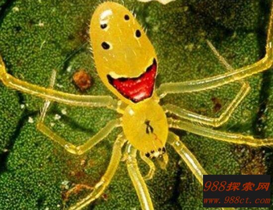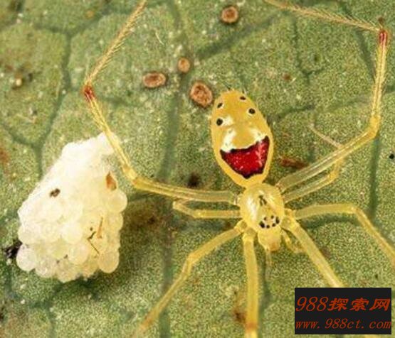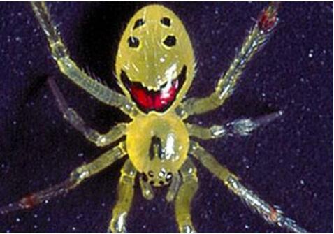 大家看到这种蜘蛛是不是感到非常可爱,没错这就是称之为笑脸蜘蛛。在它的肚子上长有一张微笑人的脸,看见它你的心情似乎变得开朗起来。这种蜘蛛是没有一点毒性的,所以大家可以放心下来。