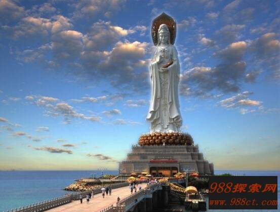 这座南海观音是位于我国三亚,其身高为108米,直径为120米观音岛上。整体为一体化三尊造型,脚踏108瓣莲花宝座。在莲花宝座下是1.5万平方米的圆通宝殿。整座观音佛像,气势十分宏达,被誉为世界上最大一座观音殿堂。