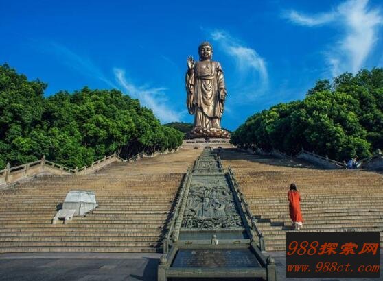 灵山大佛是位于江苏省无锡市,是城市重要标志之一,整个大佛高为88米,其中佛体为79米,莲花瓣为9米。全部是由锡青铜板块拼装焊接,总用铜量达七百余吨。其佛像十分庄严,凝重细致,凸显出佛法慈悲的发相。