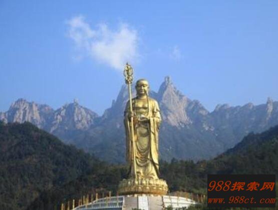 这座佛像是坐落在四大佛教名山之一九华山上,其佛像高为84米,是目前世界上最大一座露天地藏王菩萨大铜像。地藏菩萨为比丘相,右手持锡杖,左手持摩尼宝珠。面向西北方,端庄慈祥,以示“昭示众生,国泰民安”。