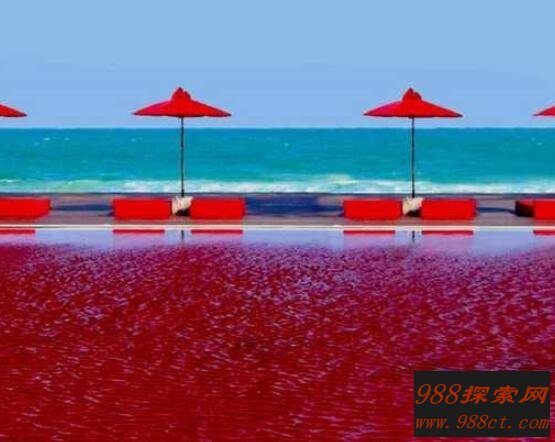 你看整个游泳池都是红色的,虽然红色是一种喜庆颜色,但是特殊情况特殊看待,看看鲜红的血就知道有多么惊悚了,甚至一些人看到血就会晕血,更别说在里面游泳了。不过大家不要害怕,泳池红色是由橙色、黄色和血红色的瓷砖铺垫的,在水中灯光照射下就会呈现这样景象。大家可以放心去畅游吧。