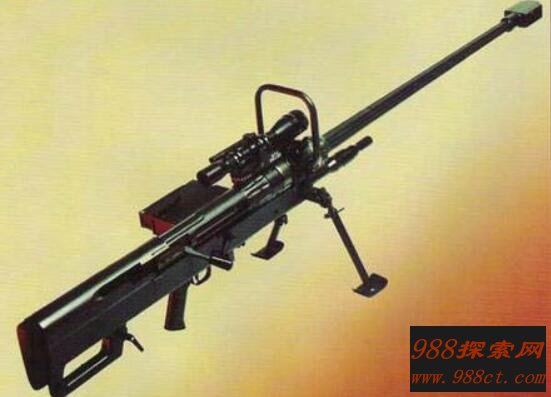 这把NTW-20狙击步枪是世界公认杀伤力最强最凶猛的,全枪长度达1.795米,总重量61斤,口径20毫米。由于体型比一般狙击步枪大,所以在操作上需要两个人才可以完成。这把枪由南非托尼于1995年发明,具有较高精确打击能力,能够击穿飞机、坦克、军车等一系列军事武器。