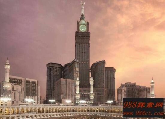 麦加皇家钟塔饭店坐落在沙特伊斯兰教圣城麦加,整座大楼高601米,建筑总面积150万平方米,楼层120。在最顶端用黄金制作一弯新月,距离四百米出建有四面钟,每面钟高80米,宽65米,直径40米,每当节庆日时候就会从钟塔上发射16条彩色光柱,真是绚丽夺目。