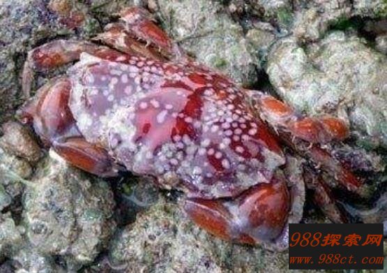 马赛克蟹又叫做绣花脊熟若蟹,体长为4厘米,宽为8厘米,全身长满红白相间网状花纹,分布在水深30米岩石或珊瑚樵中。这种蟹可不要小瞧它,是目前蟹类中最毒一种。研究称它体内含有河豚毒、麻痹性贝毒、海葵毒,这些毒素能毒死45000只小老鼠。