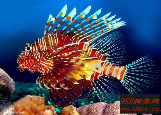 蓑鲉主要生活在温带靠海岸的岩礁或珊瑚礁内,最大特点就是观赏,体表色彩鲜艳美丽,体长20-30厘米。大家在观赏时候一定要注意,切记不可触摸它,因为它是一种有毒鱼,遇到危险时背部尖刺释放出来毒液,一旦中毒就会导致昏厥现象,但是不足以致命。