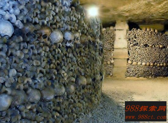 巴黎地下墓穴是世界著名的藏骨堂,对于这座墓穴来历,是在1786年因法国爆发严重瘟疫,为了解决墓地不足和公众卫生危机问题,于是将市区所有公募尸骨移到此地。目前整个墓穴共有600万具尸骨,总长达300公里,时刻充满阴森恐怖气息。