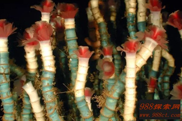 管虫又叫做蠕虫,它们的上端带有红色的肉头,下端则是白色的矿物质管子,它的名字管虫就是来源于此,管虫的身体能够生长到1-2米,看起来就像是巨型的花朵,科学家估算,部分管虫的寿命可能超过了250岁,它们大多生活在深海之中,是滤食性的生物,对水质的要求非常高,管虫的身体之中,有数以亿万计的共生菌,正式因为这些细菌的供养,它才能够生存。