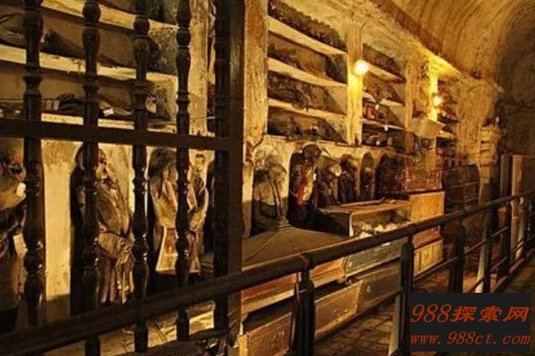 巴勒莫嘉布遣会修士地下墓穴位于意大利西西里岛,在这一墓穴的墙壁上悬挂和陈列着8000具木乃伊尸体,这些木乃伊尸体穿着昂贵的衣服,脖颈和脚都被吊钩悬挂,就是像是在默默祈祷,另外木乃伊的尸体摆放姿态不同,被评为为世界十大古墓稀世珍宝之一。
