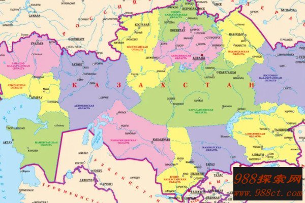 哈萨克斯坦位于亚洲中部,北部与俄罗斯相邻,南部与乌兹别克斯坦、土库曼斯坦、吉尔吉斯斯坦接壤,西部濒临里海,东接中国,其领土范围横跨亚欧两洲,以乌拉尔河作为界限,国境线总长度超过1.05万千米,东南端是天山山系,最高峰别斯巴坎峰的海拔达到4464米。