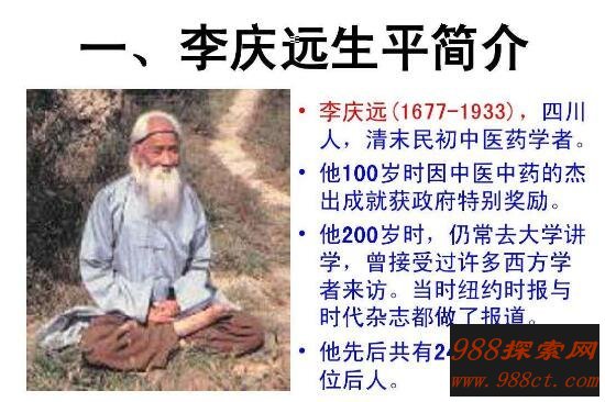 李庆远是清朝时代的人物,他先后经历了清朝九代王朝直至民国时期,按照这个年代来推算的话李庆远总共活了256岁,也因此被称为世界上最长寿的人,不过这只是人们推算出来的结果,所以还没有被吉尼斯纪录所证实,不过这证实了网上传出世界上活了1300岁的人是假的。