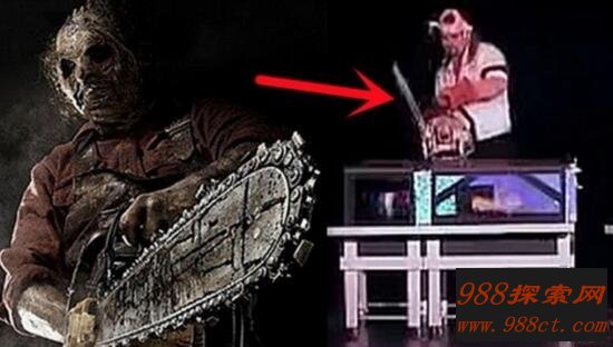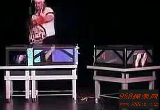 而且魔术开始后,魔术师首先将一块刀片从道具箱的中间切入,此时箱内的妻子一切安好,手脚都能动弹。随着魔术失误锯死妻子高潮的到来,魔术师手拿一把大电锯朝箱子中间拦腰砍下,魔术师还用手挠了一下妻子的脚掌。