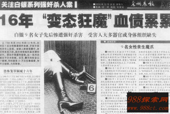白银连环杀人案是曾经发生在甘肃的一件非常残忍的恶性连环奸杀案件,凶手在1988年到2002年之间的14个年头里残忍奸杀了11名女性同胞!凶手不仅仅只是奸杀这么简单,他还十分变态的割掉数名被害者的女性生殖器官,最小的被奸杀的还只是个8岁的小女孩!手段残忍令人发指,致使白银市众多女子惶惶不可终日,连门都不敢出!终于善恶到头终有报,这个作恶了30年的杀人魔头高承勇终于被刑警成功抓到,这起白银的连环杀人案也于3月30日公开宣判,接下来就由988探索网带大家来看看这个杀人恶魔到底做了哪些伤天害理的事!