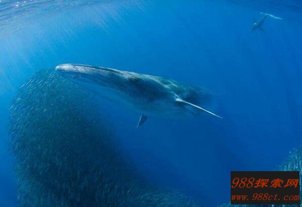 布氏鲸,背部深灰色,腹面黄白色,平均长度在12米左右,曾有摄影师捕捉到极为罕见的一幕,墨西哥拉巴斯海岸的科特兹海拍摄到一只成年的布氏鲸跃出水面,看上去就像是一条巨大的鳗鱼在空中飞行。