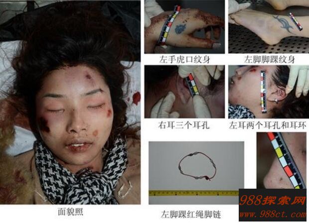 这具女尸年龄在25随走有,头发挺长,卷发。身高1.58米,鼻子左侧有穿孔,上身是穿着粉色小西装,下身穿黑色裤袜。左胳膊上还残留有大量血迹,身上有严重人为损伤。左手虎口处还有纹身,右手戴银白色戒指(食指),尸体旁边还有黑桃5、方块J、黑桃K三张扑克牌。