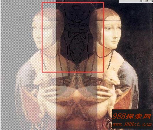 同样是将《抱银鼠的女子》给镜像,在上图红框框中,我们可以看到一副外星人的简笔画,与岩间圣母的外星人模样极为神似。