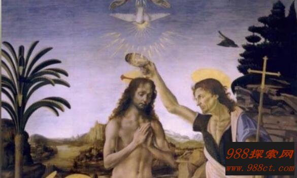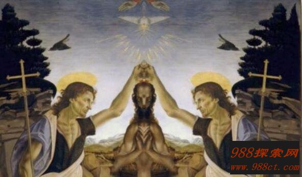 在《圣施洗约翰》中也不例外,将其镜像一下就会得到这样一个古怪的画面,完全是一副外星生物的模样,其头上发光的东西,则有可能是飞碟。仔细看,你会发现,这些外星人的长相十分的相似,很可能是同一种外星人。