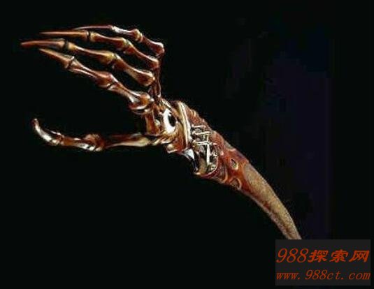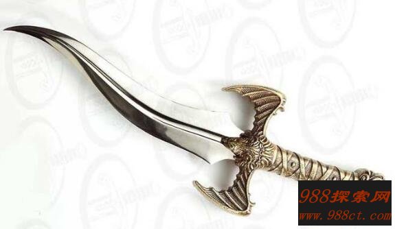 这把刀是十四世纪意大利的一个疯铁匠所铸,是世界十大禁用刀中最诡异的魔刀,他将自己妻子的右手砍下做成刀柄,后又将儿子肋骨做成刀刃,并把自己的小腿骨做成刀柄,献给了当时的债主,三天后债主发疯将自己一家人全部烧死了,据说后来得到这把刀的人全都发疯了,而且会像受到诅咒一样一家人全死亡!!
