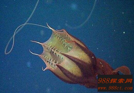 有一对 " 手臂 " 变化成可以延展的细状体,可以拉长到这种动物身体两倍的长度,它们就是利用这对伸缩自如的触手同其它短些的触手合作,一起来捕捉猎物。