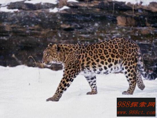 远东豹体型比较大,长为0.8-1.4米,尾长为1米,体重为200多斤。其性情十分凶猛,牙齿锋利无比,擅于擒获和撕扯猎物。主要栖息在寒温带的阔叶林中,目前全球已经剩下不到一百只远东豹,处于极度频危状态。