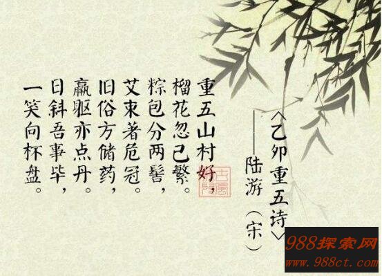 重五山村好,榴花忽已繁。粽包分两髻,艾束著危冠。旧俗方储药,羸躯亦点丹。日斜吾事毕,一笑向杯盘。这首诗作者是宋代诗人陆游,端午佳节气氛浓厚,民风淳朴,在欢乐中暗藏着一丝丝伤感,在闲适中流露出一丝丝无奈。本诗突出文章本天成,妙手偶得之的写作境界。