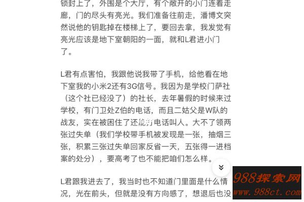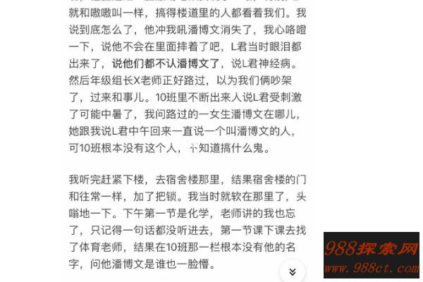 此时,诡异的事情发生了,作者和同伴一时间都迷失了方向,看见前方有光,但是却没有方向感,也无法后退,跟地下停车场一样空旷,顿时,两个人感觉热血上涌,其中一个说朝着光跑,最后不知不觉跑了出去。可是回到课堂的他们发现潘博文不见了,询问其他同学却说根本没有潘博文这个人。