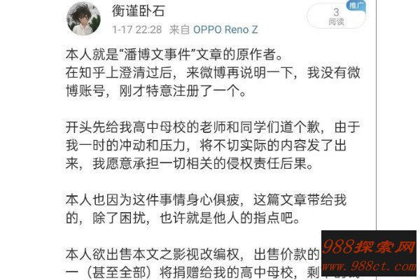 这件事一时间引起了轩然大波,引起了很多网友的关注,但是后来作者在网上承认该文章属于虚构,说自己在当时得了双向情感障碍症,而这个潘博文同学也是自己臆想出来的。双相情感障碍是指既有躁狂发作的症状,又有抑郁发作的一类心境障碍。