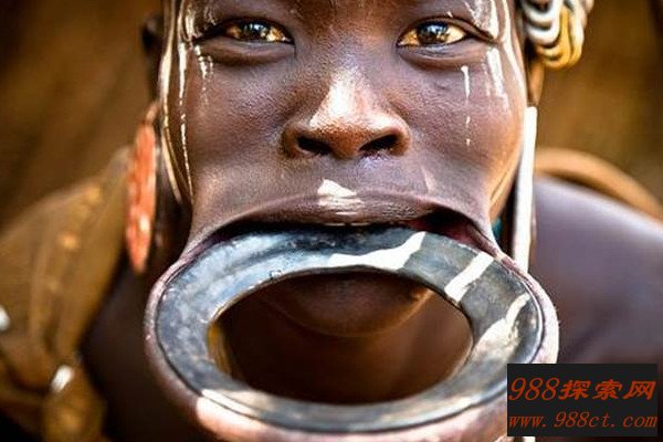 非洲还有一个盘唇族,当地的女性在8岁的时候,就要使用盘子将自己的嘴唇撑住,为了使盘子固定住,有些女孩子会拔掉几颗牙齿,以便盘子能够顺利放入嘴唇之中,每天24小时,除了吃饭的时候需要将其取下,睡觉的时候都会戴着,这在其他不理解的人眼光中,是一种非常痛苦的行为,而当地人认为是美的一种表现,盘子越大就越美。