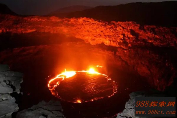 尔塔阿雷火山位于埃塞俄比亚东北部的阿尔法地区,是地球上最干燥、最低洼的地区之一,这里的岩浆非常活跃,就像湖水一样把这里包围,常年保持这种罕见的景象,人来无法踏足。