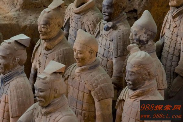 秦始皇陵中的兵马俑陪葬坑是坐西向东建造,由三个呈品字排列的俑坑组成,最早发现的是一号俑坑,俑坑呈长方形,坑内有8000余兵马俑,四面的斜坡有门道,一号俑坑的左右两侧分别叫二号坑和三号坑,整个俑坑的结构采用地下坑道式建筑,坑顶至坑底的高度为3.2米。