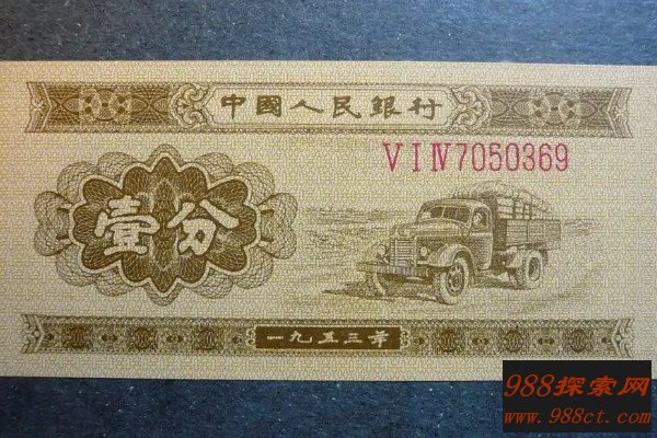 1953年版的一分纸币主要颜色为米黄色,正面图案是汽车,背面图案是中华人民共和国国徽和中国人民银行壹分的汉、蒙、维、藏四种文字的图案,这也是人民币首次采用综合四种民族的文字设计,纸币的尺寸是90x42.5毫米,另外1953年版一分纸币分为两大类。