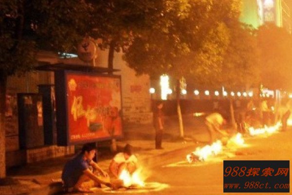 七月十五这一天人们会在晚上在路边烧金银衣纸、冥纸以及香烛,并且摆放祭品,这些冥纸是烧给鬼魂的,传说在焚烧冥纸时鬼魂们会聚集在这里,如果在焚烧冥纸的时候乱踩捣乱,可能会因为引起鬼魂的不满而倒霉,另外烧纸的时候最好在地方画圈,西北角位置留一个缺口。