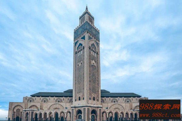哈桑二世清真寺位于摩洛哥王国卡萨布兰卡市西北部,始建于1987年8月,耗资5亿多美元。此清真寺有三分之一的面积建在海上,用来纪念摩洛哥的阿拉伯人祖先自海上来。