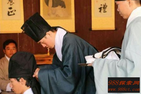 冠礼举行的时候,由贵宾依次加冠三次,就是依次戴上三顶帽子。首先加用黑麻布材质做的缁布冠,表示男子从此有参政的资格,能担负起社会责任。然后再加用白鹿皮做的皮弁,表示从此要服兵役以保卫社稷疆土。最后加上红中带黑的素冠,表示从此可以参加祭祀大典。