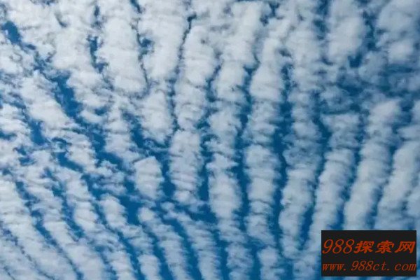 高积云类似于卷积云,但它的覆盖范围更广,云层更厚,白中有暗,它预兆着天气情况良好,通常出现于暴雨之后,悬浮在5000-6000米的高空中。