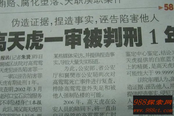 2006年,公安部、省公安厅和襄樊市公安局联合对高莺莺死亡事件进行复查。检方认为是高天虎捏造事实,并伪造证据,诬告陷害王某某,想要让其受到刑事追究,侵犯了他人的人身权利,而且妨害了司法机关的正常活动,高天虎的行为构成了诬告陷害罪。