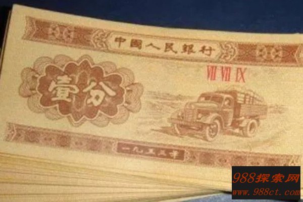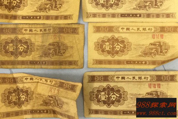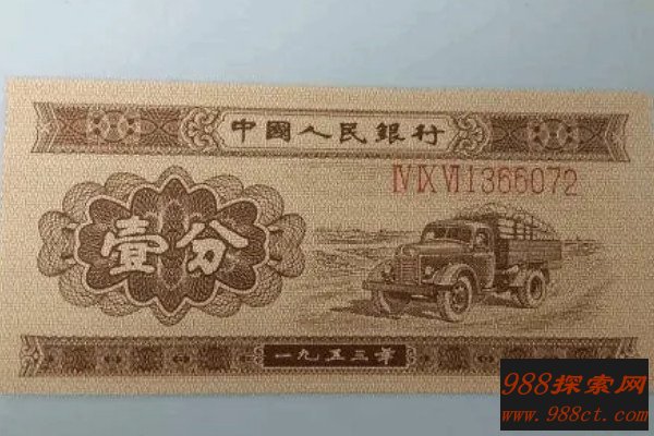 现在收藏的1953年的一分钱纸币主要是最开始的一批限量纸币,这一套纸币的正面是解放牌汽车的茶色,为主体颜色,充满时代感,背面是花符、国徽等装饰物,与众不同的是最先发行的纸币上有三冠号、七号码,因此非常值得收藏。